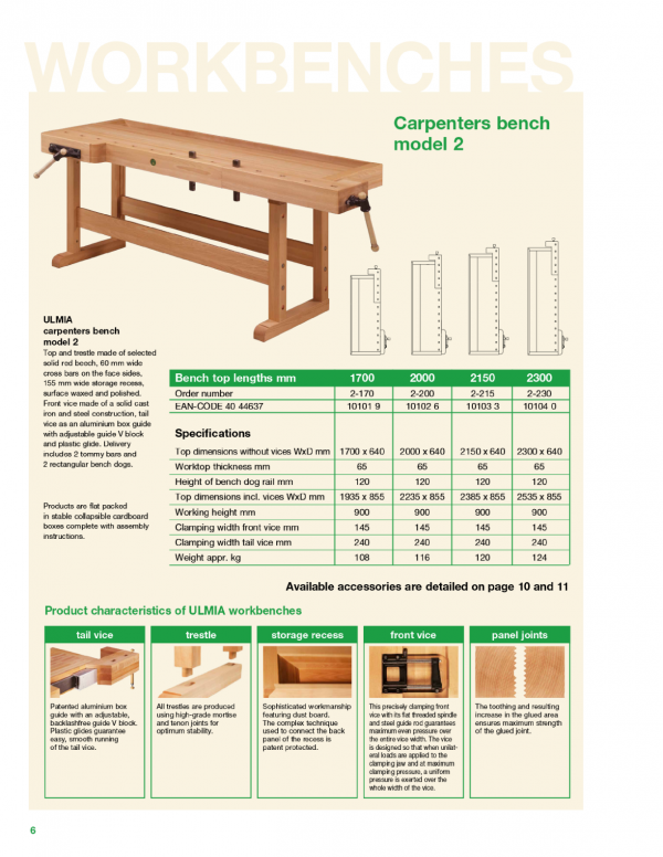 Topo e cavalete feitos de faia vermelha maciça seleccionada, barras transversais de 60 mm de largura nos lados da face, recesso de armazenamento de 155 mm de largura, superfície encerada e polida. Torno frontal feito de uma construção sólida em ferro fundido e aço, torno de cauda como guia de caixa de alumínio com bloco V de guia ajustável e deslizamento de plástico. Os produtos são embalados em caixas de cartão desmontáveis e estáveis, completas com instruções de montagem.